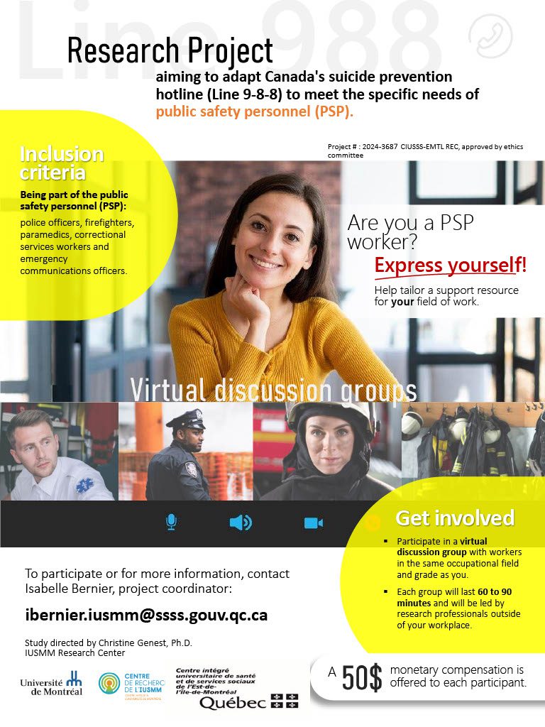 There are various suicide prevention mechanisms, including telephone crisis lines, but PSPs appear unlikely to use such services. The main barriers to using these services are stigma, fear of confidentiality, and the feeling of not being understood by the interveners because of their particular work context. To address this concern, there is a need to offer services tailored to the needs of the PSP population, including the offering of specific services in the context of Canada’s suicide prevention crisis line. It is therefore important to explore what are the cultural specificities and needs of those PSPs and how to adapt services to meet these specificities and needs. If you have any questions, you can contact Isabelle Bernier, the project coordinator, by email at the following address: ibernier.iusmm@ssss.gouv.qc.ca